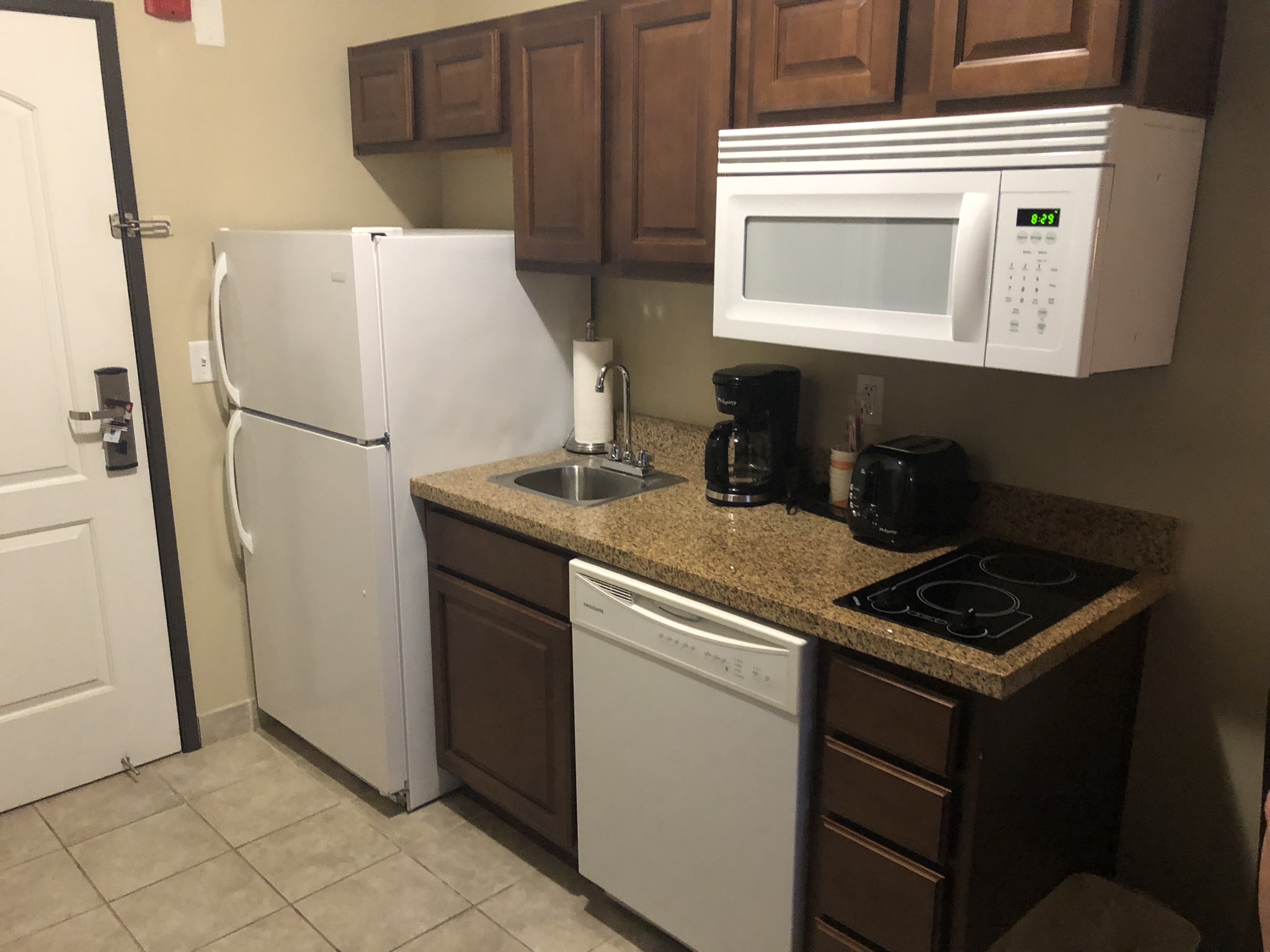 It was great. The room featured a kitchen Microwave, a full fridge, a counter-top stove, cabinets full of useful dishes, and of course a dishwasher to clean up after your food preparation.