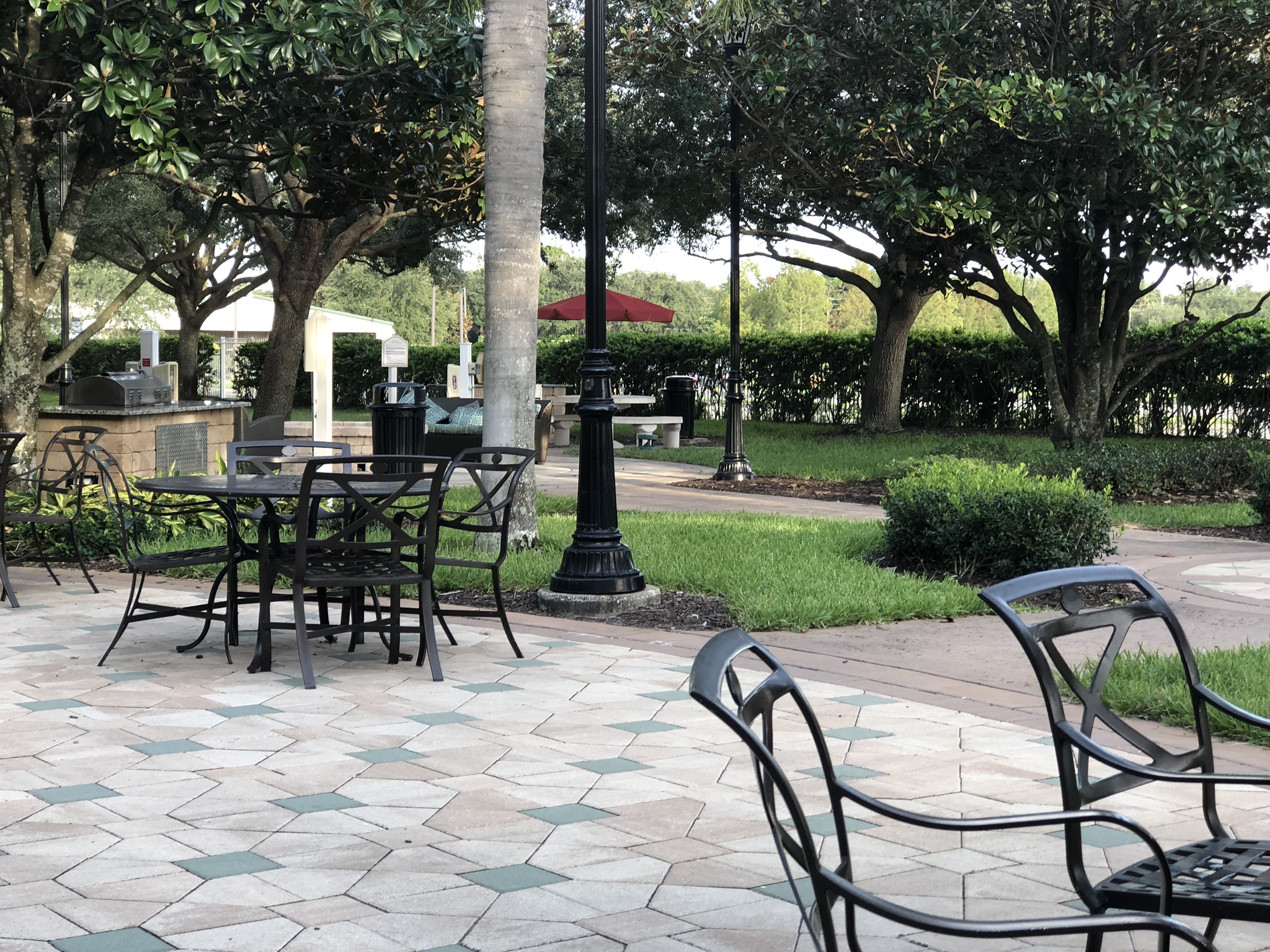 The outdoor area – The area features a fire pit, several gas grills to cook outside, plenty of seating, a grass play area, and a basketball court.