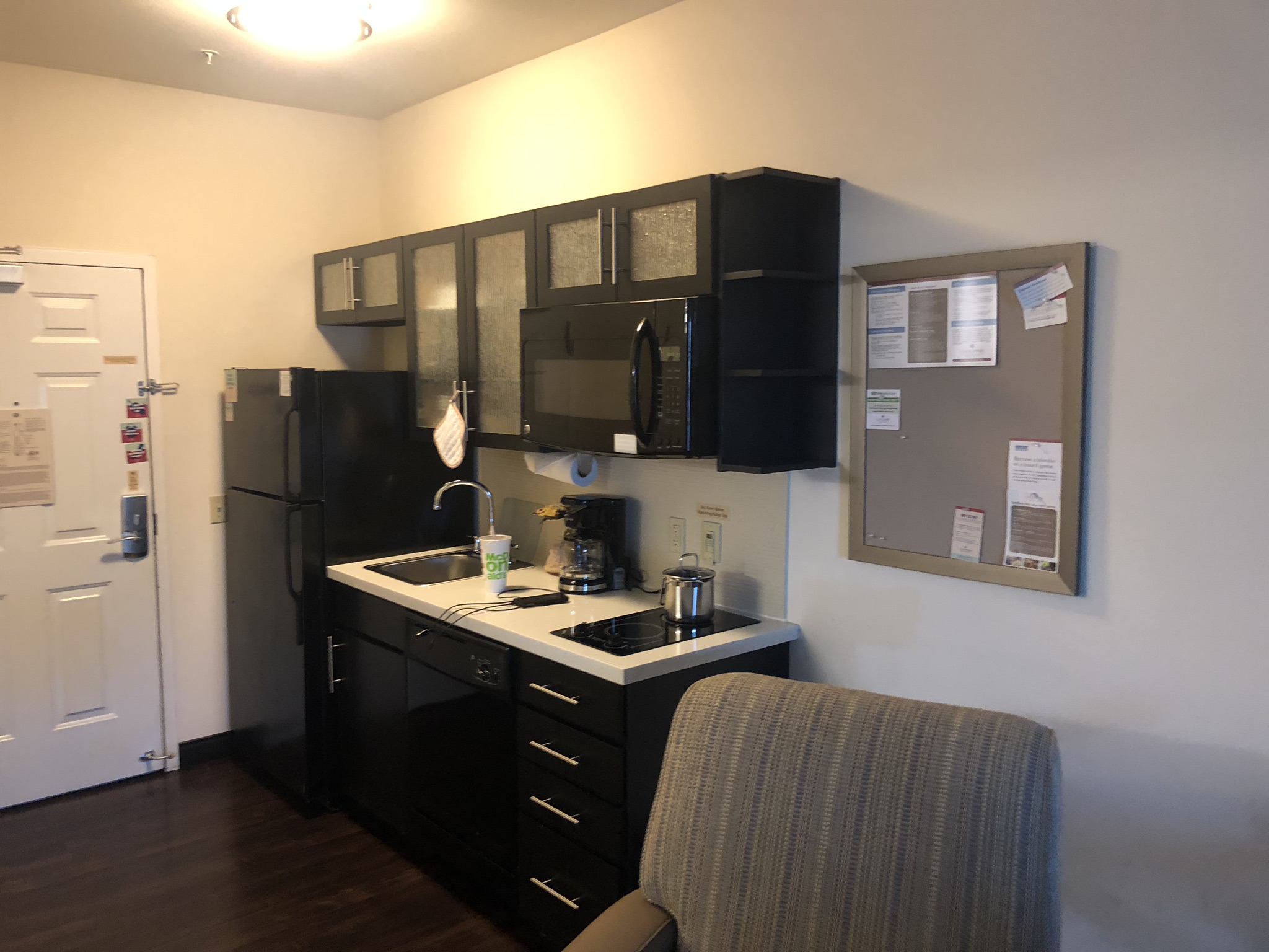 As you can see from above the rooms are an extended stay layout. They offer a kitchen, full size fridge, sink, dishwasher, counter stove top and microwave.